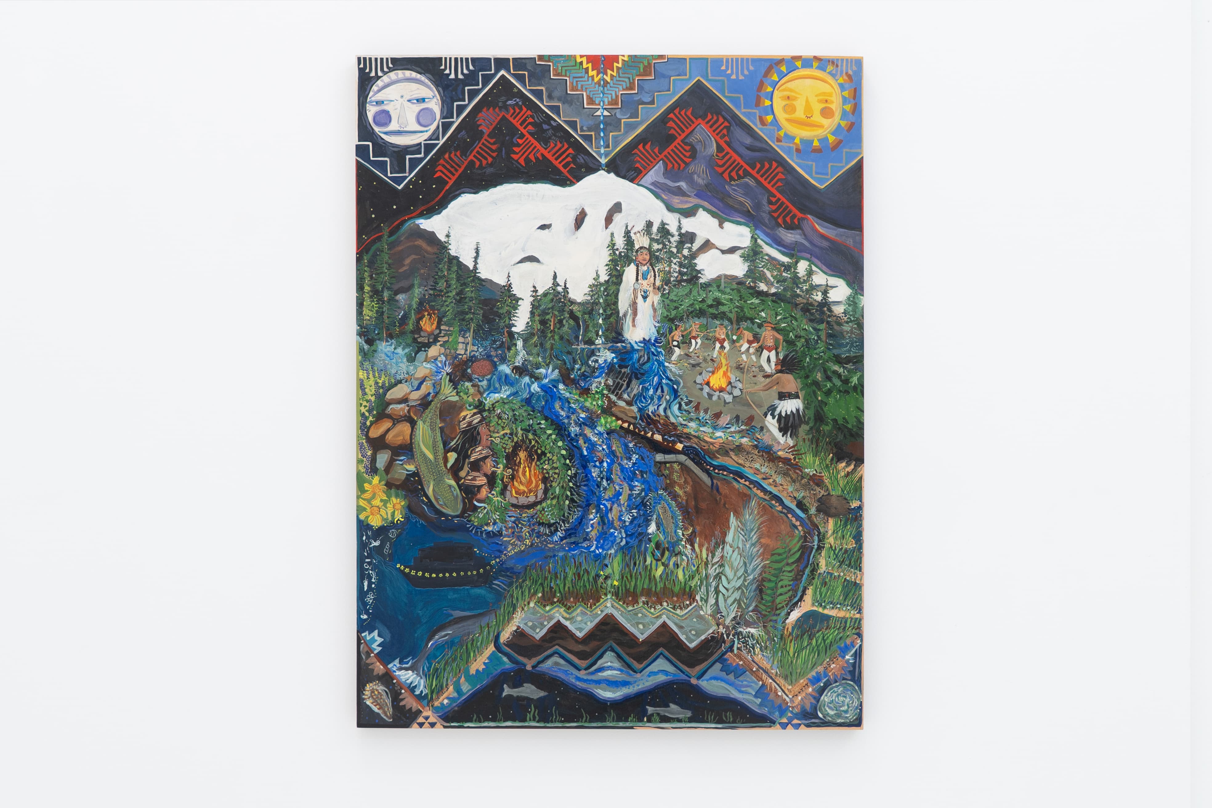 Through the space between her act of painting and the work itself is an experiment and interrogation with how this present chapter in the Modern world has defined “human.” Although the Anthropocene was not introduced into popular consciousness to describe the current geological age until 2000, many scholars within geography, anthropology, and the humanities have tapped the year 1492 as a symbolic beginning to what we now know to be our own current crisis of man-made environmental change. With the rapid land-grab of the mid-millennia by Western nations, came a new suite of rights taken as self-evident to the consciousness of domineering societies. These rights include the right to destroy worlds and manufacture them as new, as well as the right to declare what is new and subsequently othered, backwards, tired, and obsolete. (1) Historian T.J. Demos points out in his Against the Anthropocene that this time also inaugurated the joining of the two hemispheres under a kind of global capitalism, one that still writes the definition of progress today. Under this rule, Anthropocentric thinking has occluded the varied historic human (Indigenous) understandings of nature as well as blanketed the burden of climate crisis as a universal event, despite its very obvious disproportionate effects that communities experience all over the globe due to a matrix of inequalities from economic resources, habitable infrastructure, and social alienation.