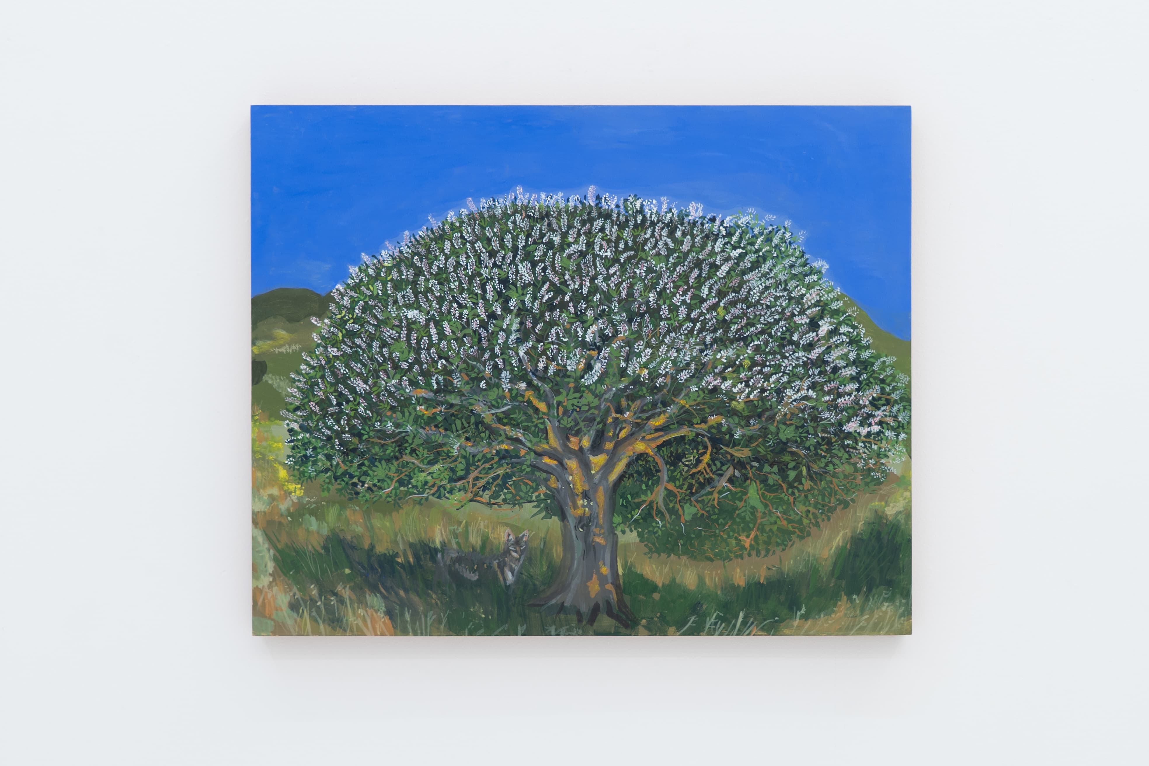 When I visited her studio a few weeks ago, a Coastal Oak Tree had fallen, stricken with an illness colloquially known as sudden oak death. She explained that it caught it from its neighbor, the Bay Laurel. It had toppled into the creek next to her home and now connected the dune we stood upon to the speedway I had driven in on. She mentioned wanting to walk across it. I imagined the ravine 100 miles tall. It stretched out below us further than what could be seen, to the depths of the earth all full of the unknown. That which is unfathomably old, and also mysteriously new. It does stretch out though, doesn’t it? To my eye perhaps not really, but to a squirrel it might – or an ant. Familiar things become strange, uncanny, expansive, encyclopedic, and then familiar again; so we trade in religions, in pigments, in lessons in time.