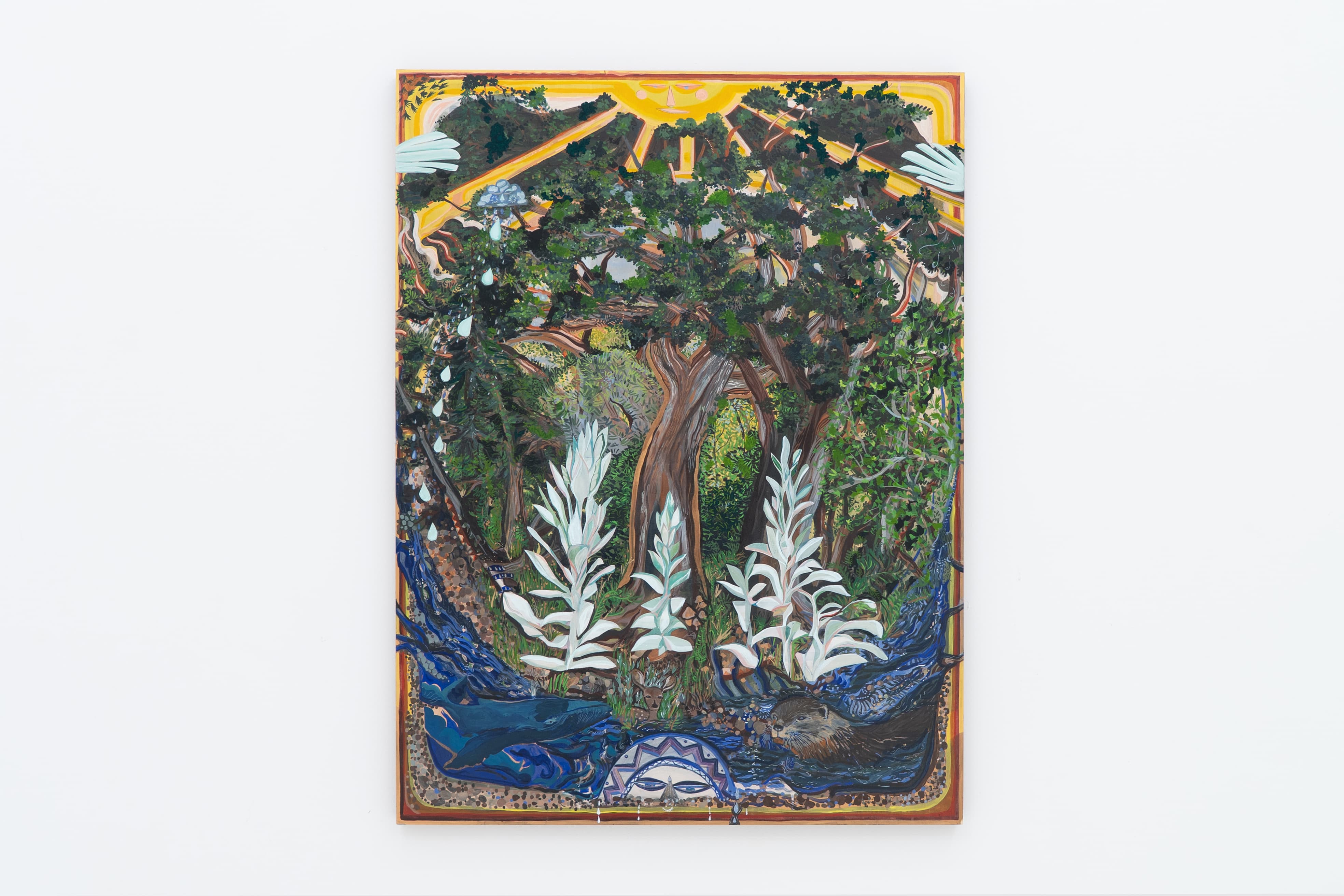 Through the space between her act of painting and the work itself is an experiment and interrogation with how this present chapter in the Modern world has defined “human.” Although the Anthropocene was not introduced into popular consciousness to describe the current geological age until 2000, many scholars within geography, anthropology, and the humanities have tapped the year 1492 as a symbolic beginning to what we now know to be our own current crisis of man-made environmental change. With the rapid land-grab of the mid-millennia by Western nations, came a new suite of rights taken as self-evident to the consciousness of domineering societies. These rights include the right to destroy worlds and manufacture them as new, as well as the right to declare what is new and subsequently othered, backwards, tired, and obsolete. (1) Historian T.J. Demos points out in his Against the Anthropocene that this time also inaugurated the joining of the two hemispheres under a kind of global capitalism, one that still writes the definition of progress today. Under this rule, Anthropocentric thinking has occluded the varied historic human (Indigenous) understandings of nature as well as blanketed the burden of climate crisis as a universal event, despite its very obvious disproportionate effects that communities experience all over the globe due to a matrix of inequalities from economic resources, habitable infrastructure, and social alienation.